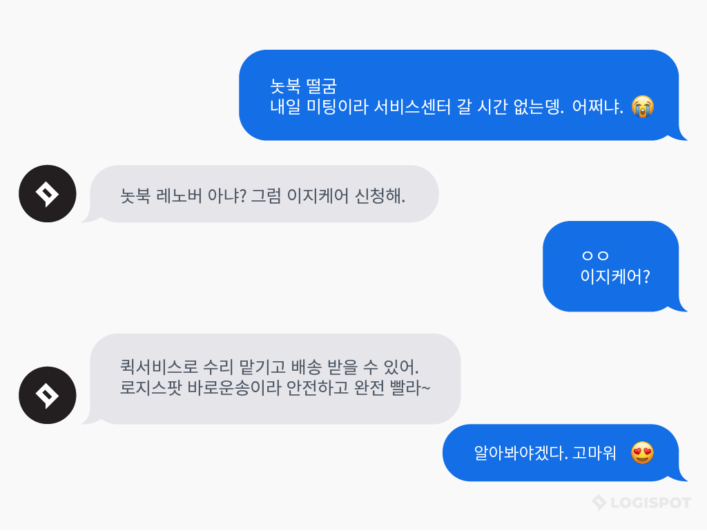 이 이야기를 들은 친구가 이지케어 서비스를 추천합니다. 레노버 고객이라면 서비스센터 방문 없이 퀵서비스로 A/S를 받을 수 있으니까요!