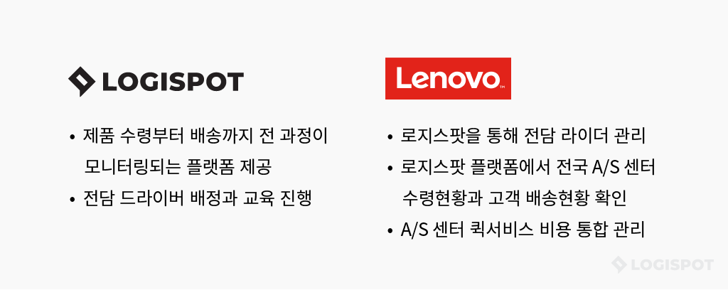 레노버의 A/S 퀵서비스 ‘이지케어’에 로지스팟 바로운송이 함께 합니다. 로지스팟은 레노버 고객을 위한 전담 드라이버 배정과 교육을 진행하고, 플랫폼을 통해 픽업부터 배송까지 전 과정 모니터링을 지원합니다.