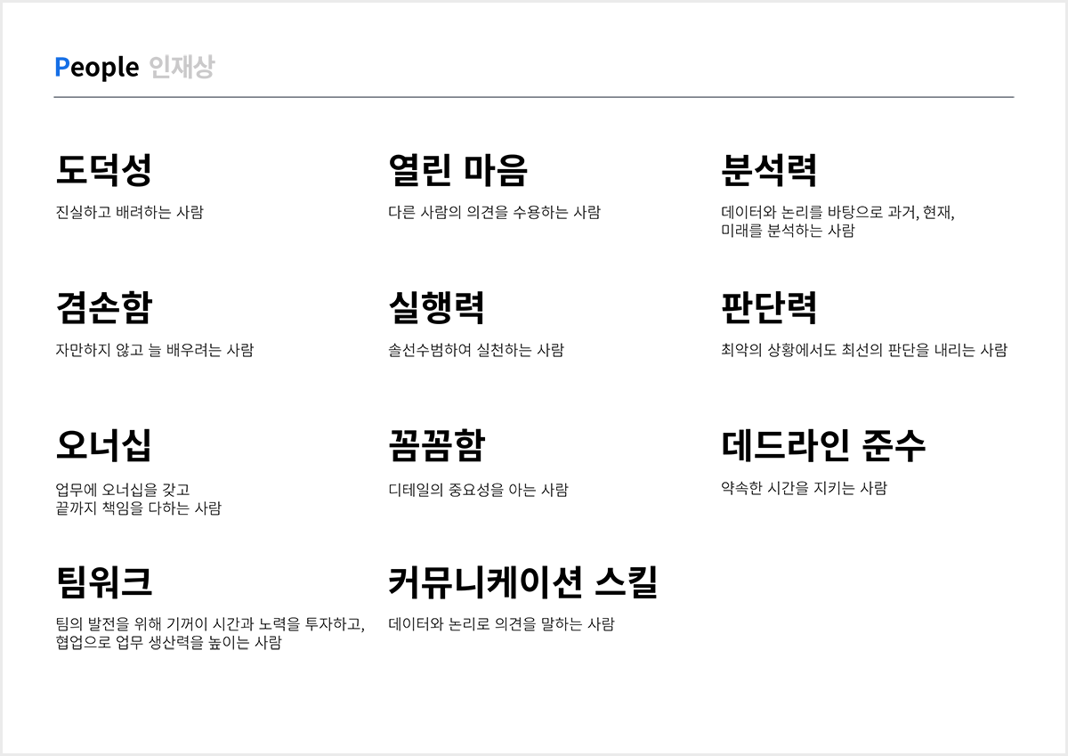 가장 중점을 둔 것은 경영진을 포함한 전 구성원의 목소리를 반영하는 일이죠. 경영진 의견을 듣고, 구성원 설문조사를 하고, CDS(Capability Driven Strategy) 프로젝트로 모두의 목소리를 모았습니다.