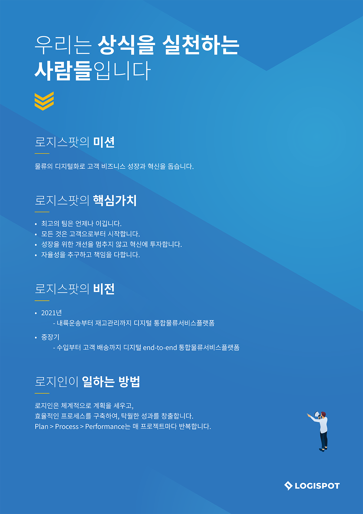 로지스팟의 11가지 인재상에 부합하는 인재를 찾고 있습니다. 그중 모든 직무에 해당되는 인재상은 오너십을 갖고 끝까지 책임을 다하는 사람, 팀의 발전을 위해 기꺼이 시간과 노력을 투자하는 사람, 데이터와 논리가 뒷받침된 의견으로 커뮤니케이션하는 사람입니다. (채용 바로가기)
