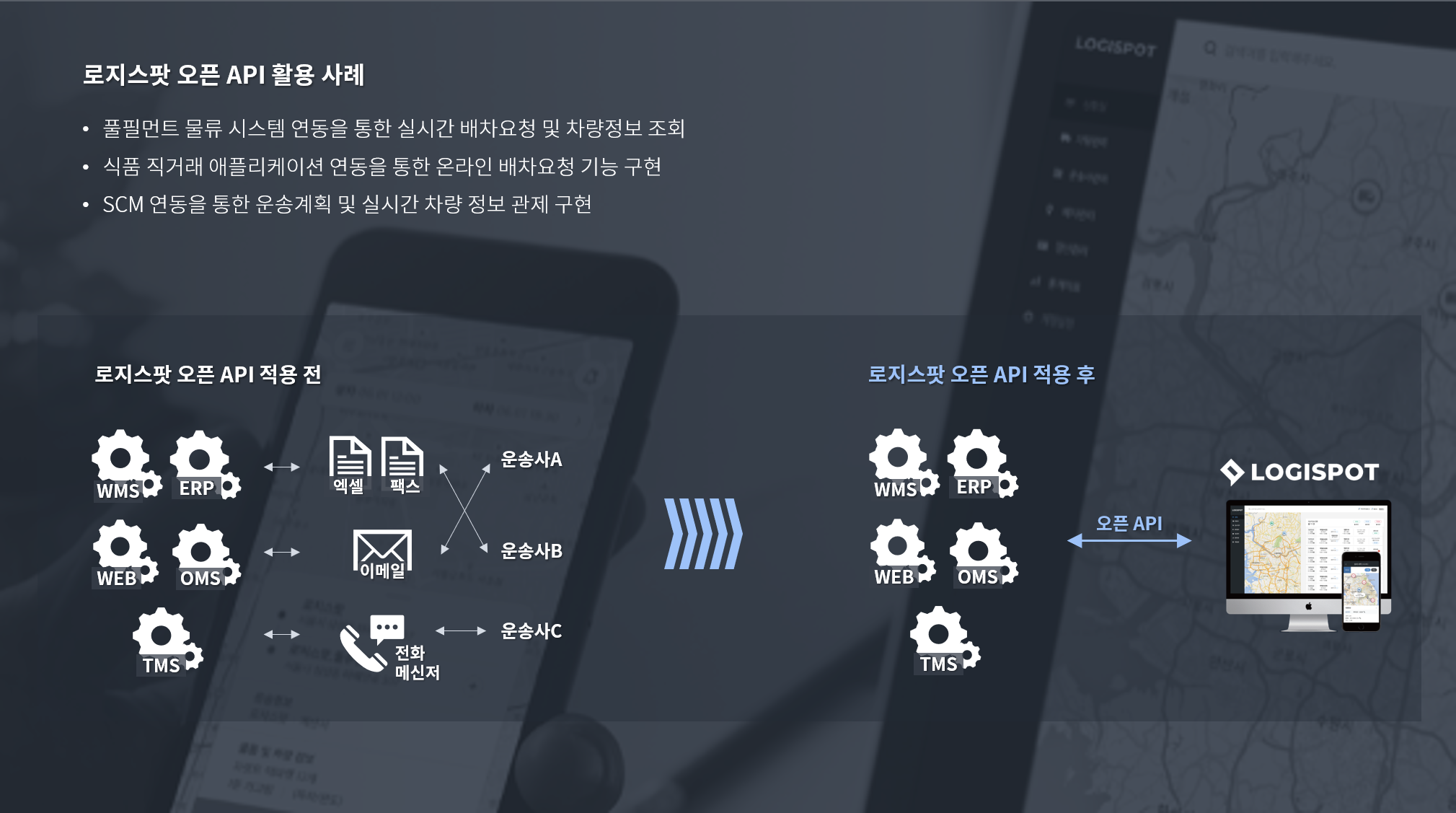 로지스팟 OPEN API란, 로지스팟의 다양한 서비스 및 데이터를 보다 쉽게 이용할 수 있도록 공개된 개발자를 위한 인터페이스입니다.