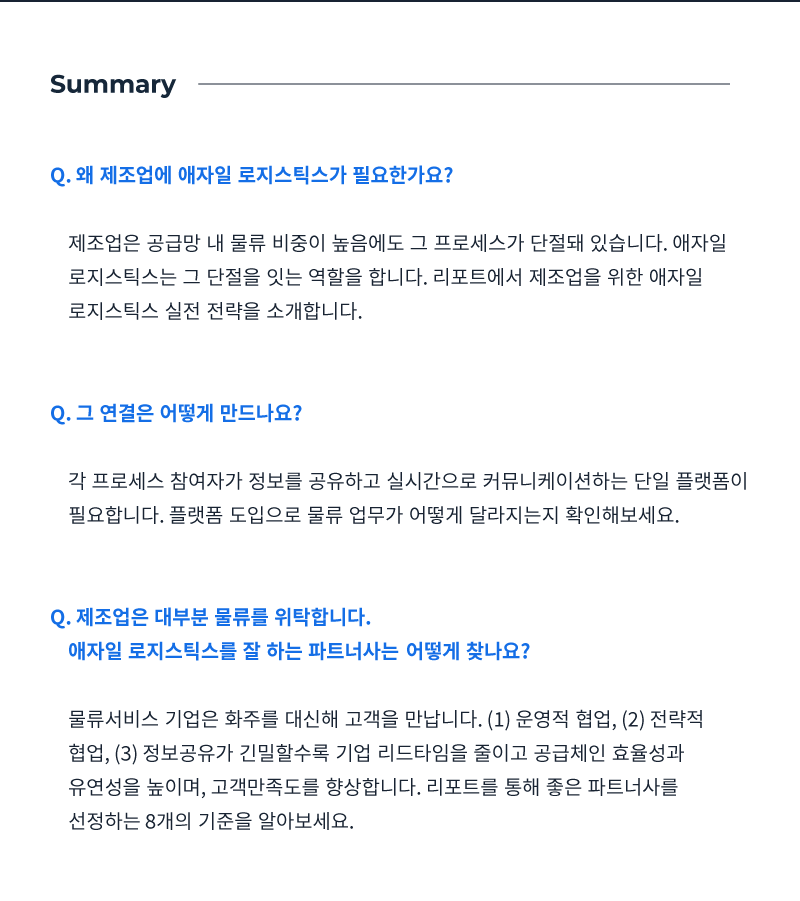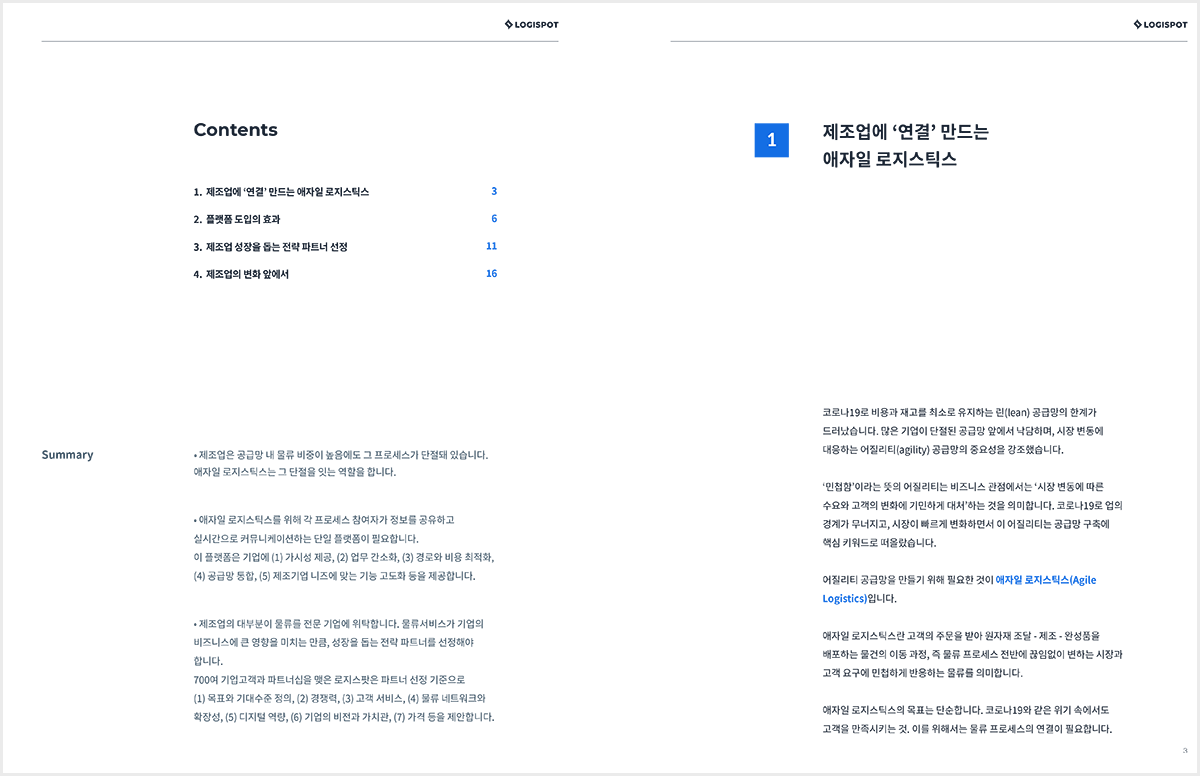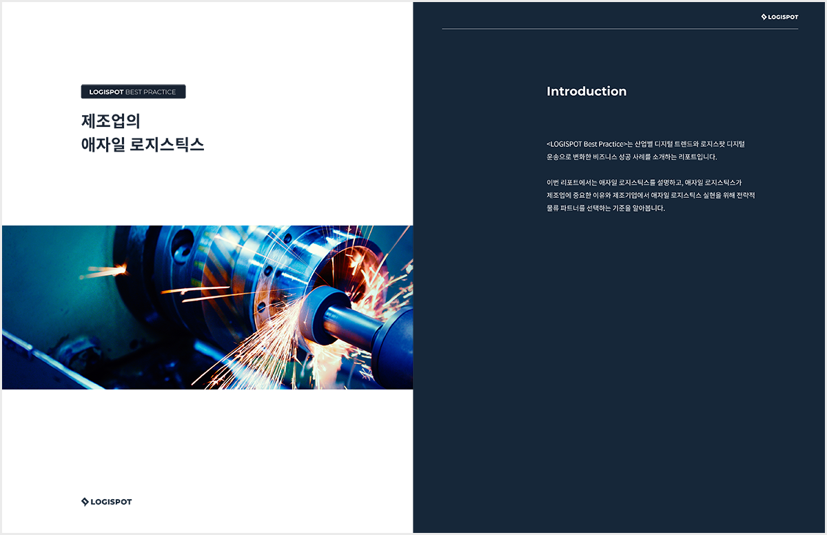 제조업 성장 위해 ‘연결’을 더하라 코로나19로 공급망 단절 사태를 겪으며 제조업이 다시 각광받고 있습니다. 하지만 물류가 과거에 머물러있다면 스포트라이트에서 빗겨 설 수밖에 없습니다.제조업 물류 혁신을 위해 애자일 로지스틱스를 제안합니다. 제조업에 ‘연결’을 더하는 애자일 로지스틱스, 로지스팟 리포트에서 만나보세요. 재조업의 애자일 로지스틱스 다운로드를 위해 아래 사항을 입력해주세요. 이름 이메일 연락처 물류비 절약을 위한 상담이 필요하신가요? 네 아니요 개인정보취급방침 및 이용약관에 동의합니다. Loading... 리포트 미리 보기 LOGISPOT See Full Bio