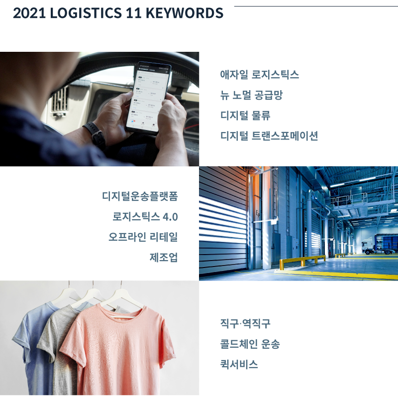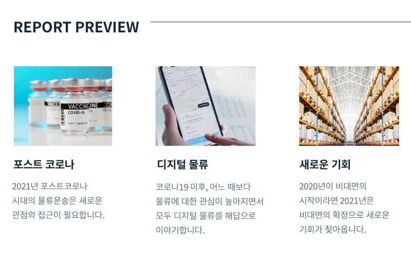 2021년의 첫 문을 여는 이 리포트는 2020년 발행한 아티클과 리포트 중, 물류운송 담당자와 고객사에 가장 좋은 반응을 얻은 글과 2021년 물류운송 트렌드로 떠오를 화두를 키워드로 묶어 정리한 글입니다.