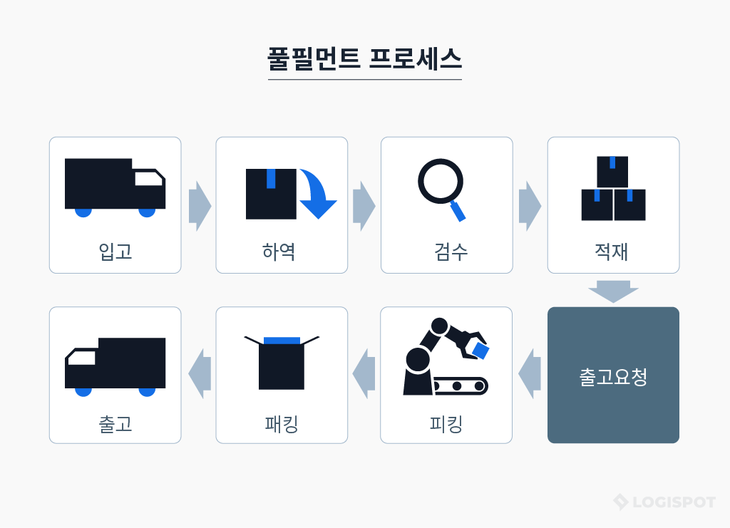 풀필먼트 프로세스. 풀필먼트란 물건의 입고, 검수, 적재관리, 피킹, 패킹, 출고 등을 통합관리하는 ‘물류의 전 과정’을 말한다.