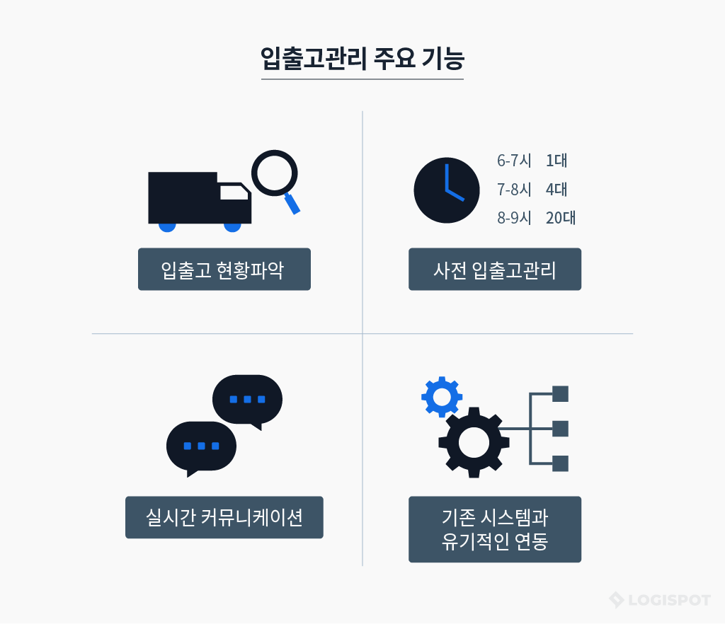로지스팟은 물류센터 또는 풀필먼트의 입출고 관리를 위해 로지스팟 입출고관리 솔루션을 제안합니다.