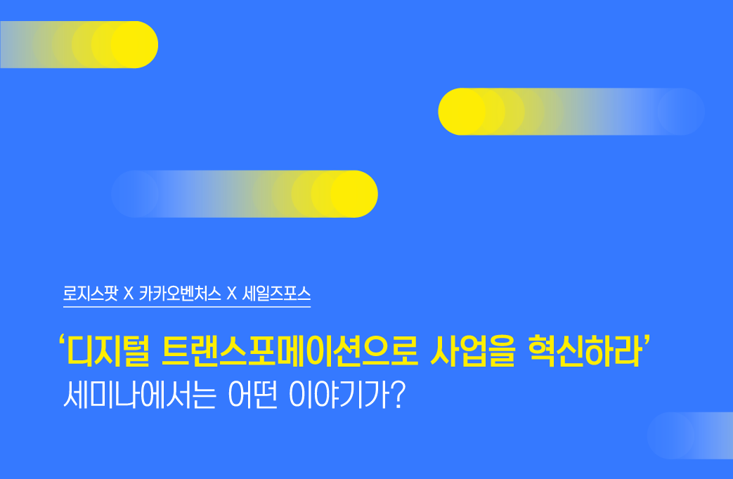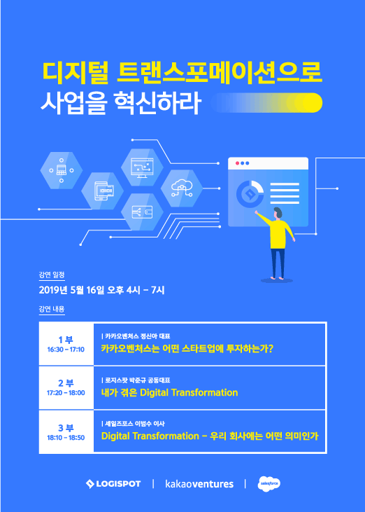 이번 세미나에는 로지스팟 뿐만 아니라, 대한민국 대표 VC 카카오벤처스와 글로벌 CRM 기업인 Salesforce 사와 함께 기업의 디지털화에 대한 이야기를 나눠보는 시간을 가졌습니다.