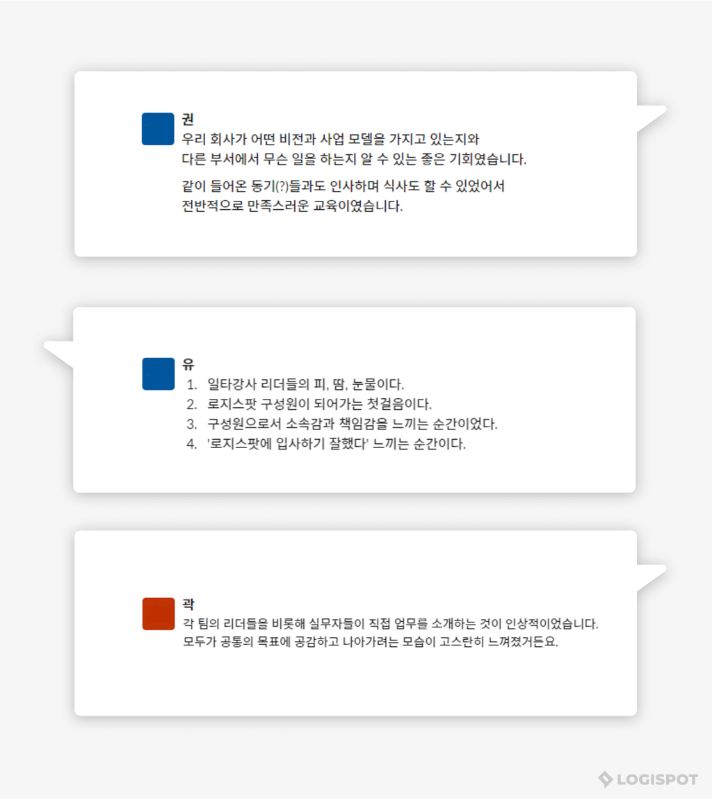 온보딩교육을 받은 신규 입사자 모두, 공감하는 포인트! “로지스팟이 어떤 비전을 가지고 일을 하는지 듣고, 보고, 느낄 수 있는 시간”이었다는 것인데요. 새로운 회사에 입사하게 되면 나뿐만 아니라, 가족이나 친구들이 내가 다니는 회사에 관심을 가장 많이 두듯이, 이런 교육을 통해 로지스팟이 어떤 회사인지를 가장 잘 설명할 수 있었으면 합니다.