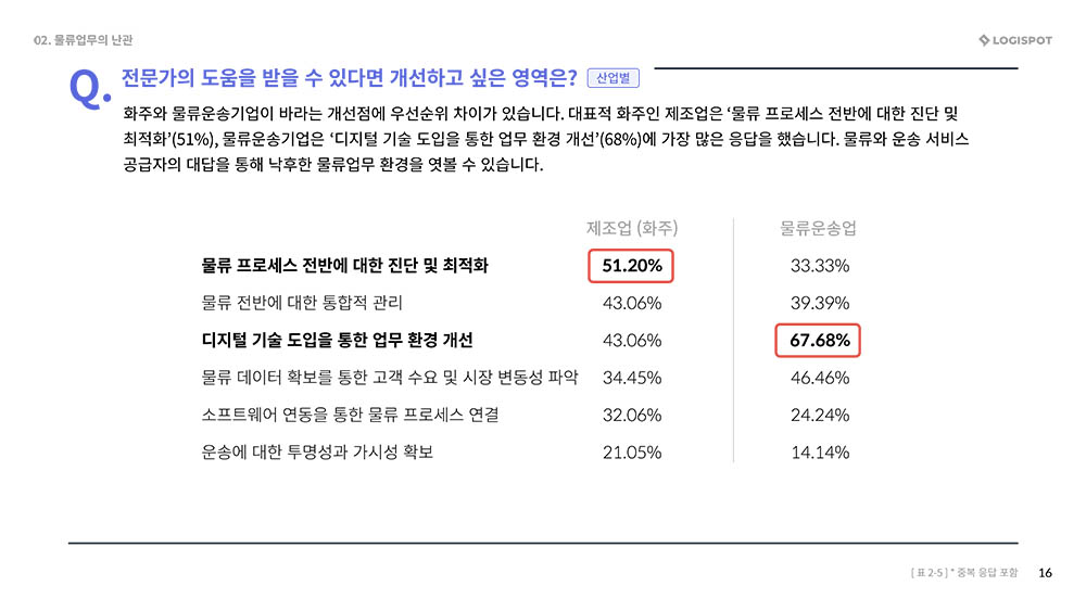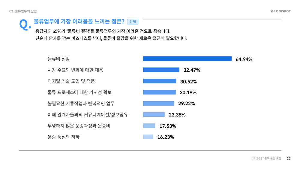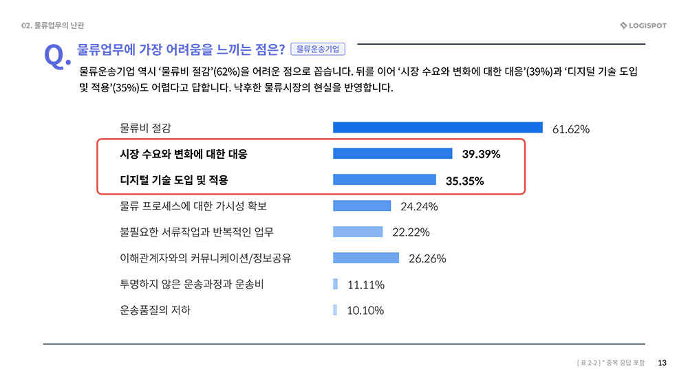물류비 절감, 시장 수요와 변화에 대한 대응, 디지털 기술 도입 및 적용에 어려움을 느낍니다.