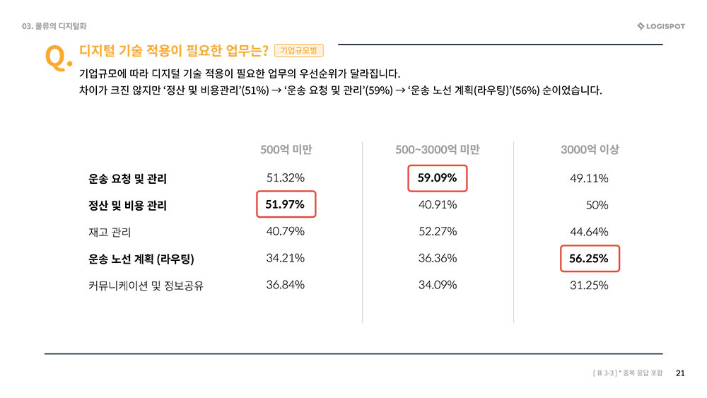 500억 미만 규모의 기업에서는 정산 및 비용관리를, 3000억 미만 규모의 기업에서는 운송 요청 및 관리를, 3000억 이상 규모의 기업에서는 운송 노선 계획(라우팅)을 1순위로 꼽았습니다.