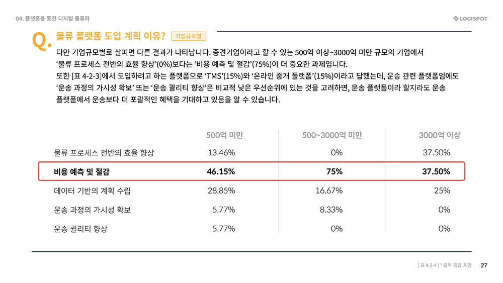 물류 프로세스 전반의 효율 향상과 비용 예측 및 절감, 데이터 기반의 계획 수립을 위해서입니다. 500억 이상 3000억 미만 규모의 기업에서는 비용 예측 및 절감에 가장 높은 응답률을 보였습니다.