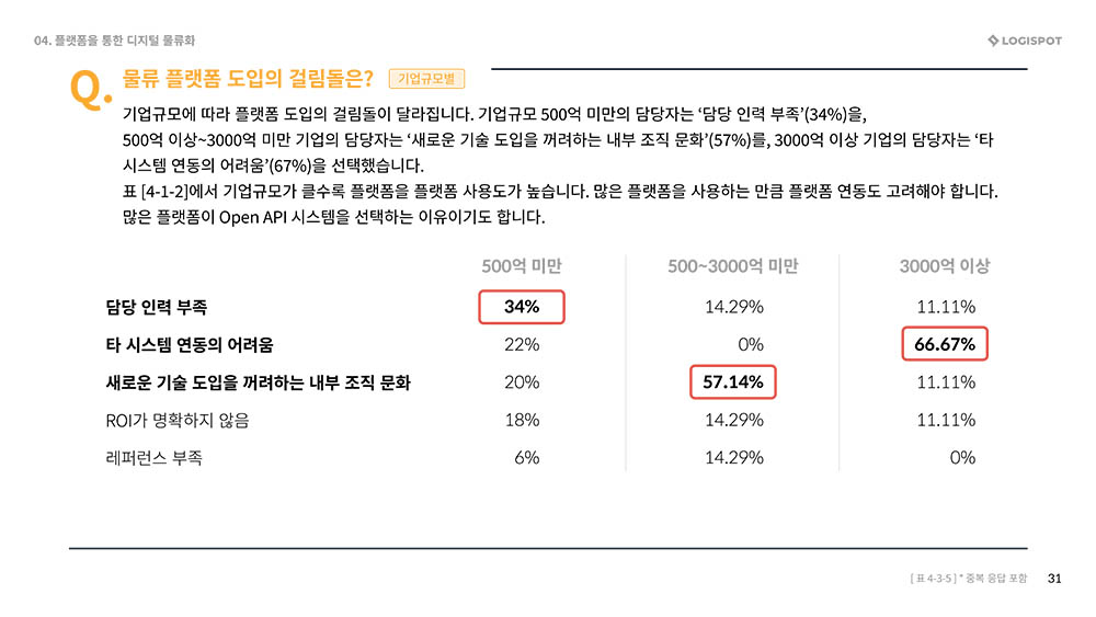 WMS, TMS, OMS 순으로 사용합니다. 기업 규모에따라 WMS 사용 비율은 15%에 66%까지 증가합니다.