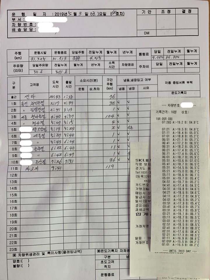 회사 소속의(또는, 운송사 소속의) 화물차량을 관리하고 있는 많은 기업들은 개별 차량의 현재 위치 및 운행 진척 상황 이외에 아래와 같은 운행 일지를 통하여 차량의 운행 내역을 수기로 작성하여 관리하고 있었습니다. 이러한 운행 일지를 통하여 고객사들은 지입차량들의 유류비 등 부대비용들을 관리하고 있습니다. 아래의 사진은 이렇게 수기로 작성된 기존 방식의 운행일지의 대표적인 예시입니다.