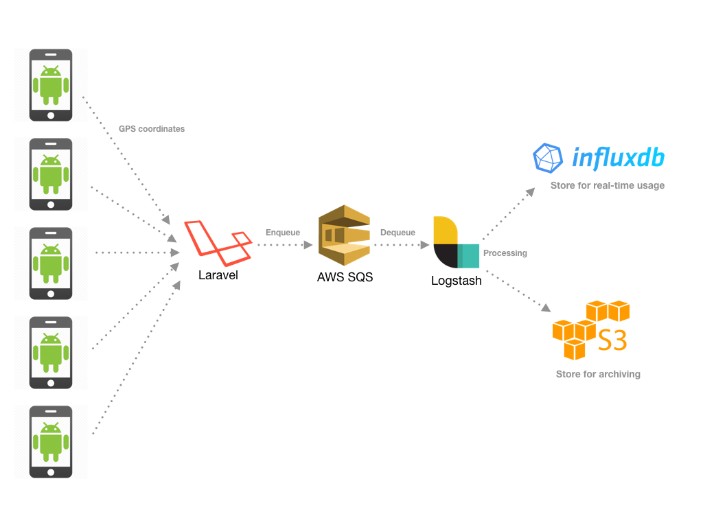 화물 운송을 수행하는 기사님들의 (암호화된) GPS 데이터는 일차적으로 REST API를 통해 Laravel 애플리케이션 서버로 전송되며 서버에서는 전달받은 데이터를 별도의 가공없이 즉시 AWS SQS(Simple Queue Service)로 전달됩니다. 이렇게 데이터를 큐로 즉시 전달하는 이유는 대량의 GPS 데이터 트래픽을 처리할 때 발생하는 부하가 애플리케이션 서버에 집중되지 않고 분산되어 비동기적으로 처리될 수 있도록 아키텍처를 구성하기 위함입니다. 애플리케이션 서버는 데이터를 전달(forwarding)하는 역할만 할 뿐 별도의 데이터베이스 트랜잭션이나 계산 과정을 수행하지 않습니다.