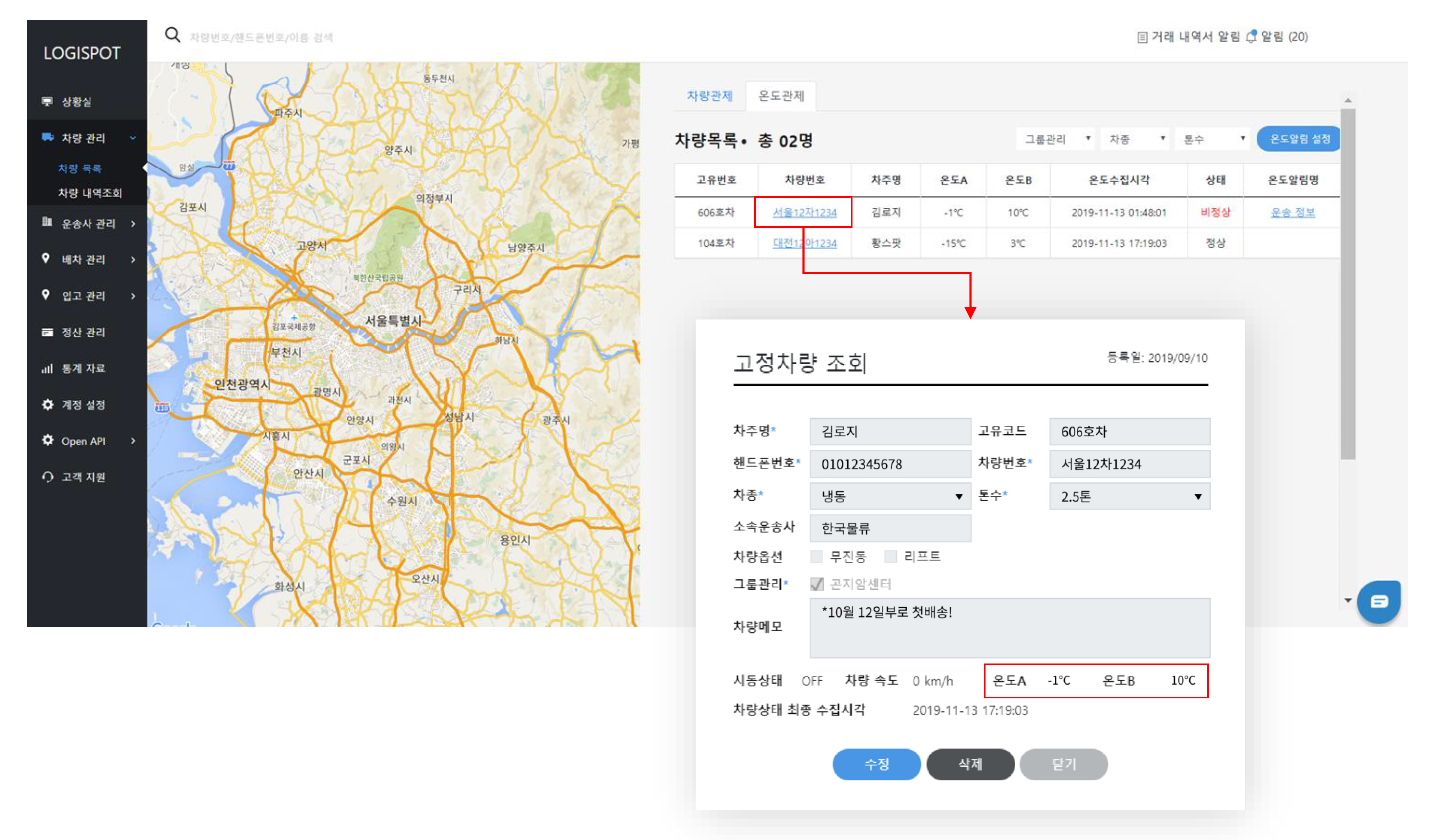 온도관제가 가능한 차량과 그 정보를 관리할 수 있습니다. 차량 목록에서 온도관제 차량번호와 차주명 현재 온도 온도수집시각 상태 등을 확인할 수 있습니다.