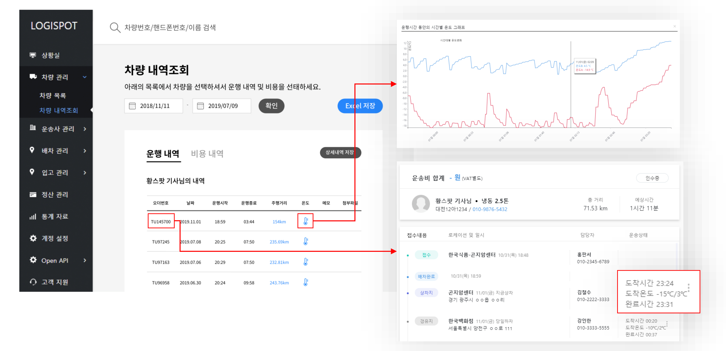 로지스팟 온도관제는 따로 신청할 필요 없이, ‘지입차관리’ 솔루션을 사용하는 기업에 제공됩니다. 세부 기능은 다음과 같습니다.