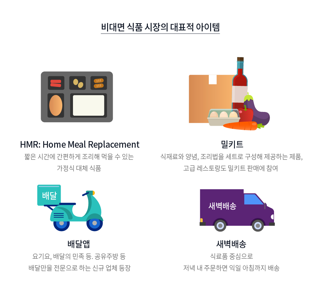 경쟁도 치열합니다. 빠른 배송은 기본이고, 유니크한 레시피와 산지 제철 식재료 조달과 같은 새로운 무기로 소비자 지갑을 공략합니다. 코로나19로 바깥 외출이 꺼리는 요즘 상황에는 이런 경쟁이 반갑죠. 오전에 회를 주문하면 저녁시간에 배달받는 서비스를 이용해봤는데, 집밥으론 흉내 낼 수 없는 ‘식당 맛’를 낼 수 있어 참 좋았습니다.