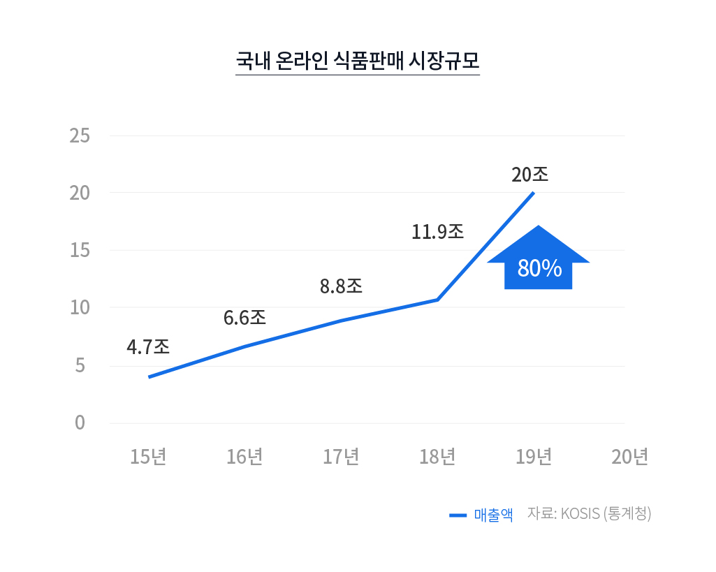 국내 온라인 식품판매 시장규모는 크게 늘었습니다. 2015년 4조7000억원에서 2019년 20조원을 돌파했고, 2020년 이 그래프는 더욱 수직 상승할 것으로 보입니다.