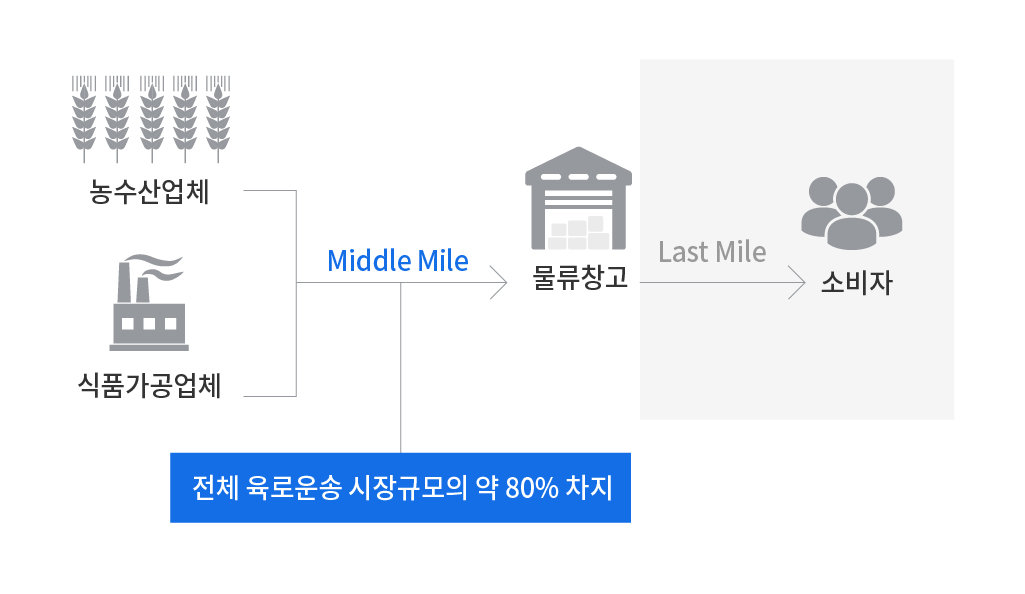 대부분이 식품 운송을 떠올리면 완제품이 고객에게 전달되기까지의 라스트마일만을 생각합니다. 식품 판매 업체도 이 이 라스트마일만을 마케팅으로 강조하고요. 하지만 라스트마일 이전의 운송, 업계에서는 미들마일이라 부르는 이 기업 운송을 간과할 수 없습니다. 원재료부터 신선하게 운송 받아야 완제품도 신선할 수 있습니다.