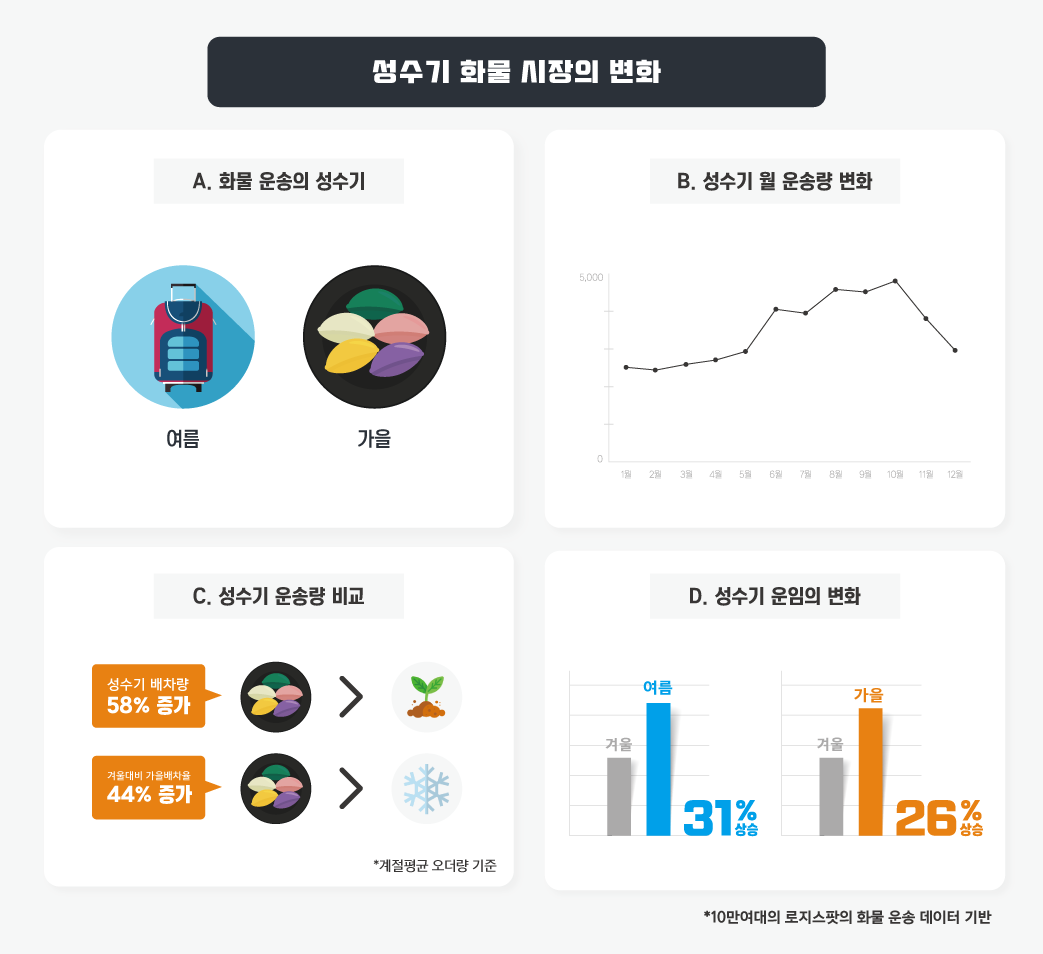 로지스팟 10만건의 운송데이터를 기반으로 분석한 결과, 운송시장 성수기에 나타나는 변화는 다음과 같습니다.